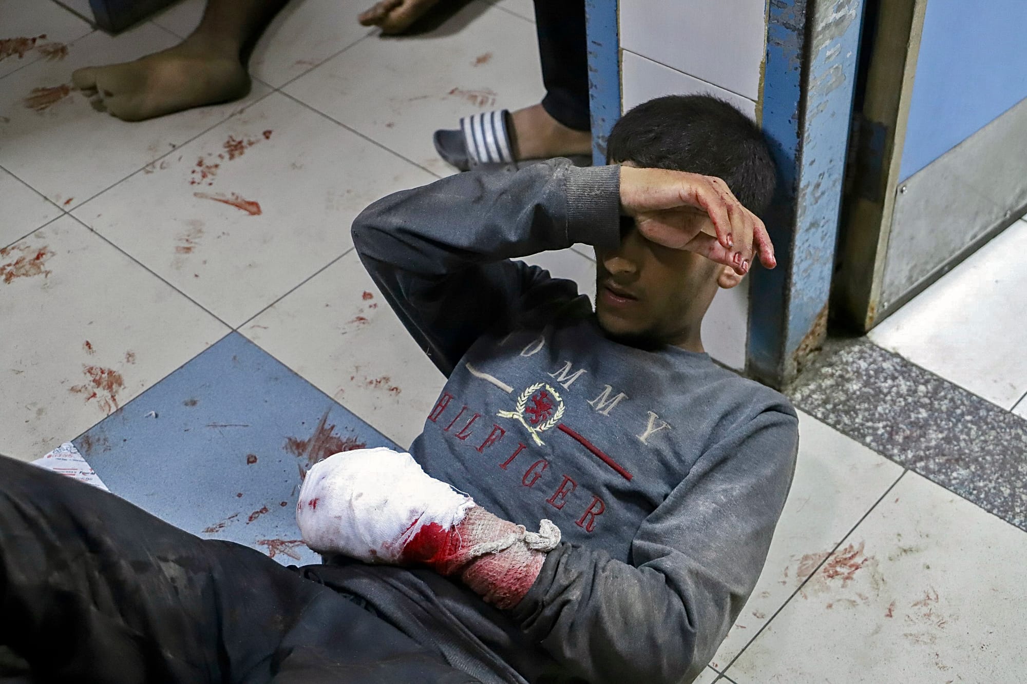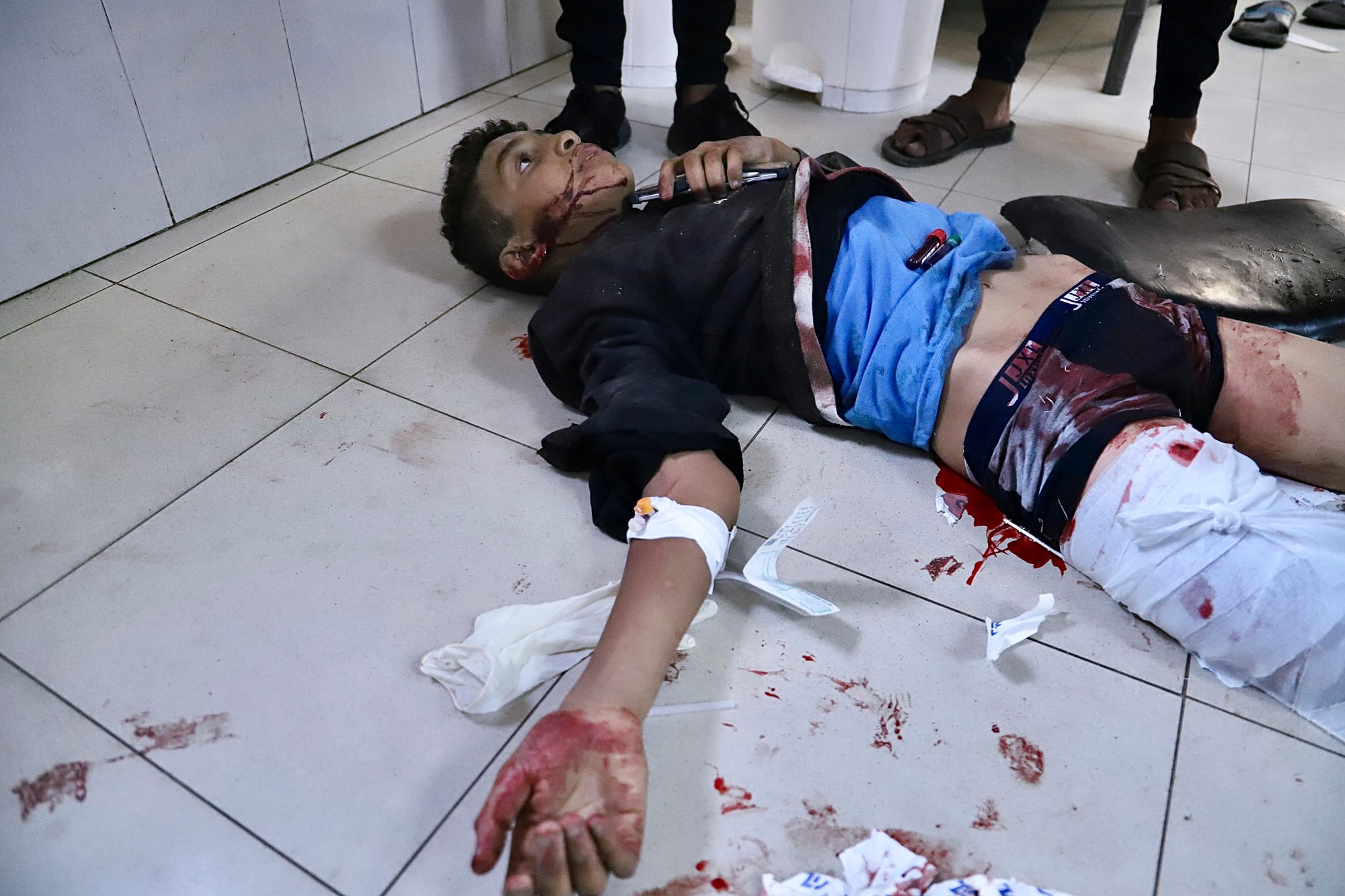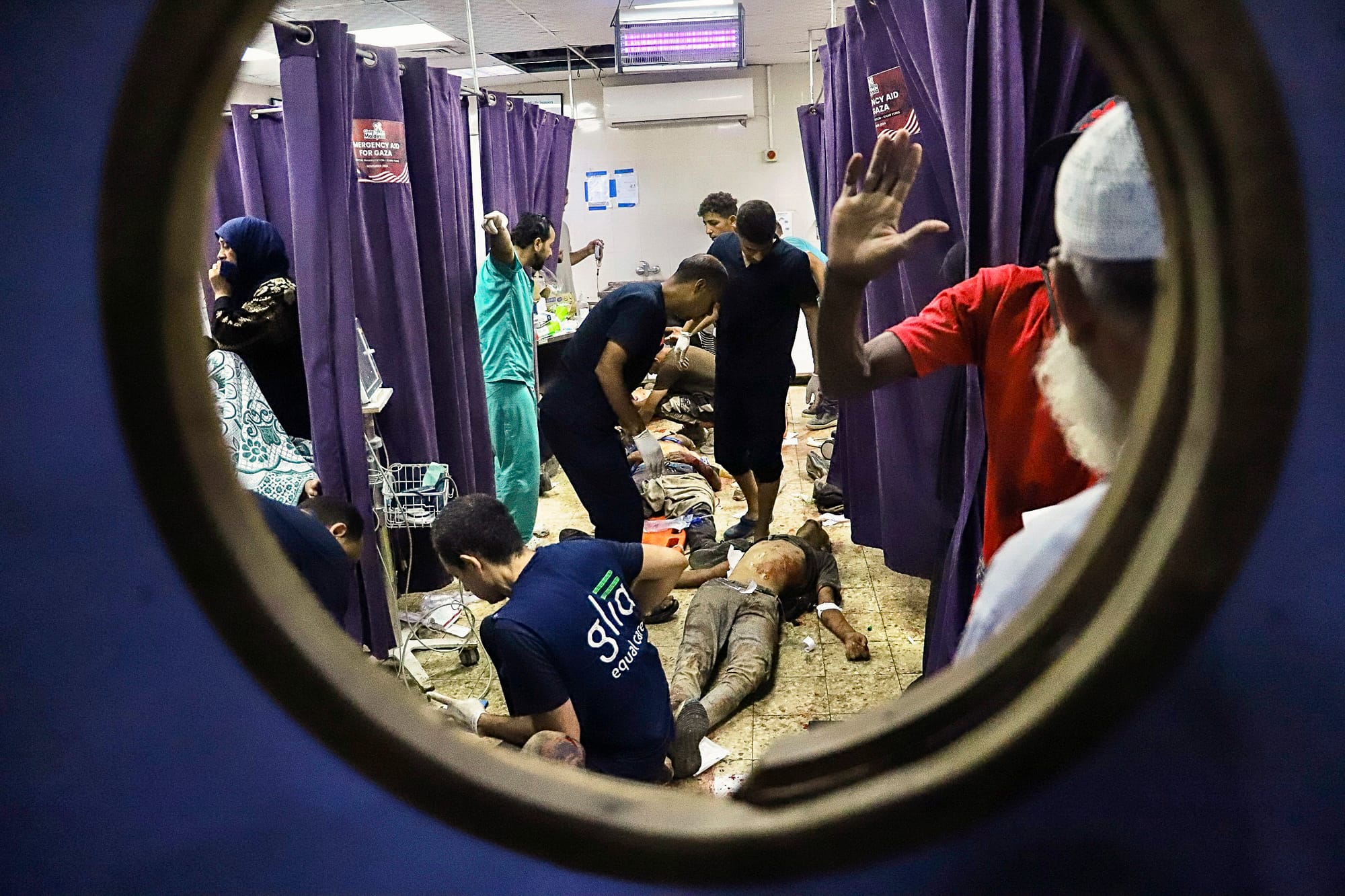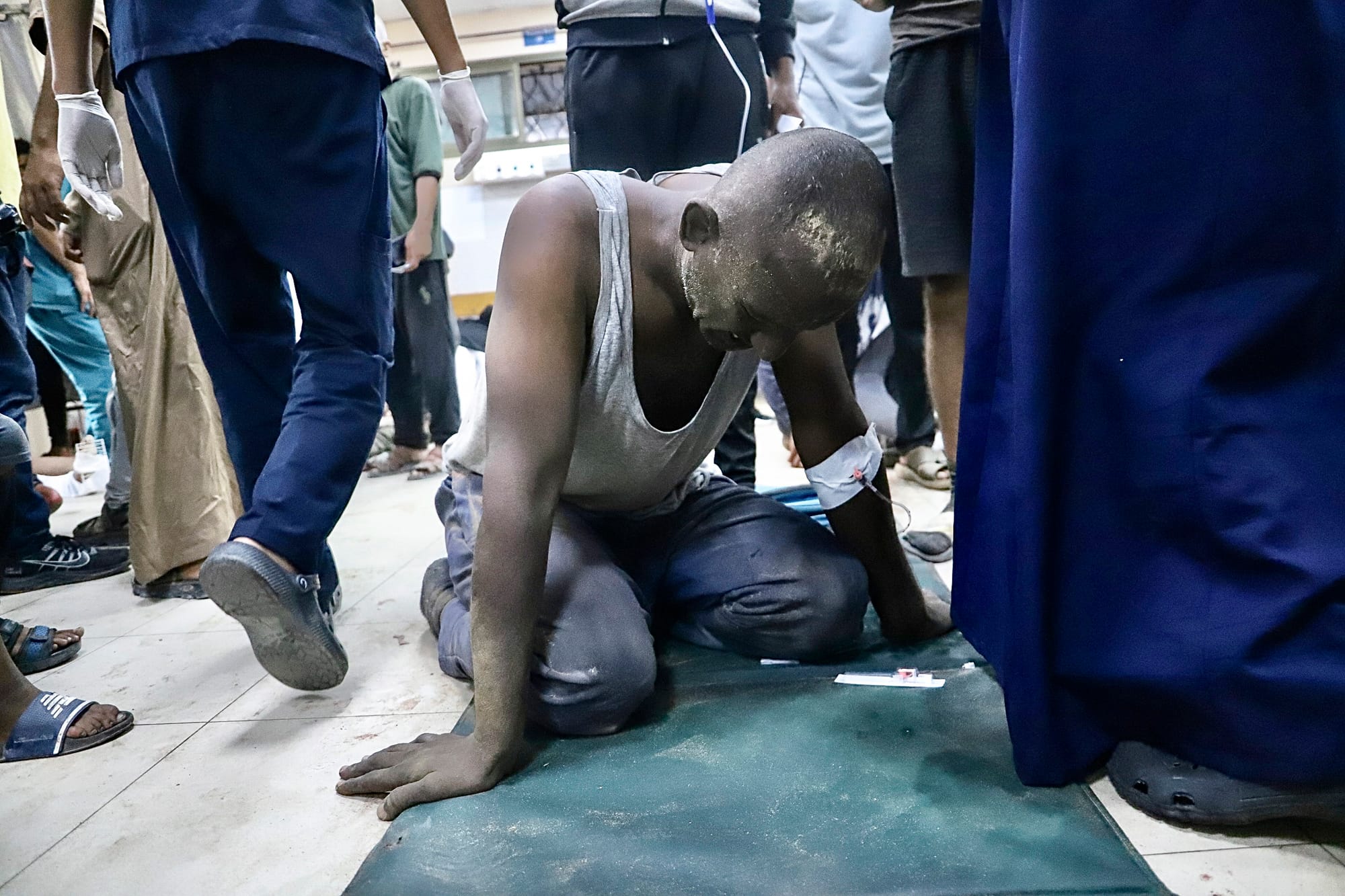 Injured Palestinians are treated on the floor of Al-Nasser Hospital in Khan Yunis, Gaza, following IDF attacks on people waiting to access Gaza Humanitarian Foundation (GHF) sites on Tina Street in Rafah on July 19 2025. According to Activestills, "Hospital sources say that at least thirty Palestinians were killed and many more injured." Credit: Doaa Albaz/Activestills