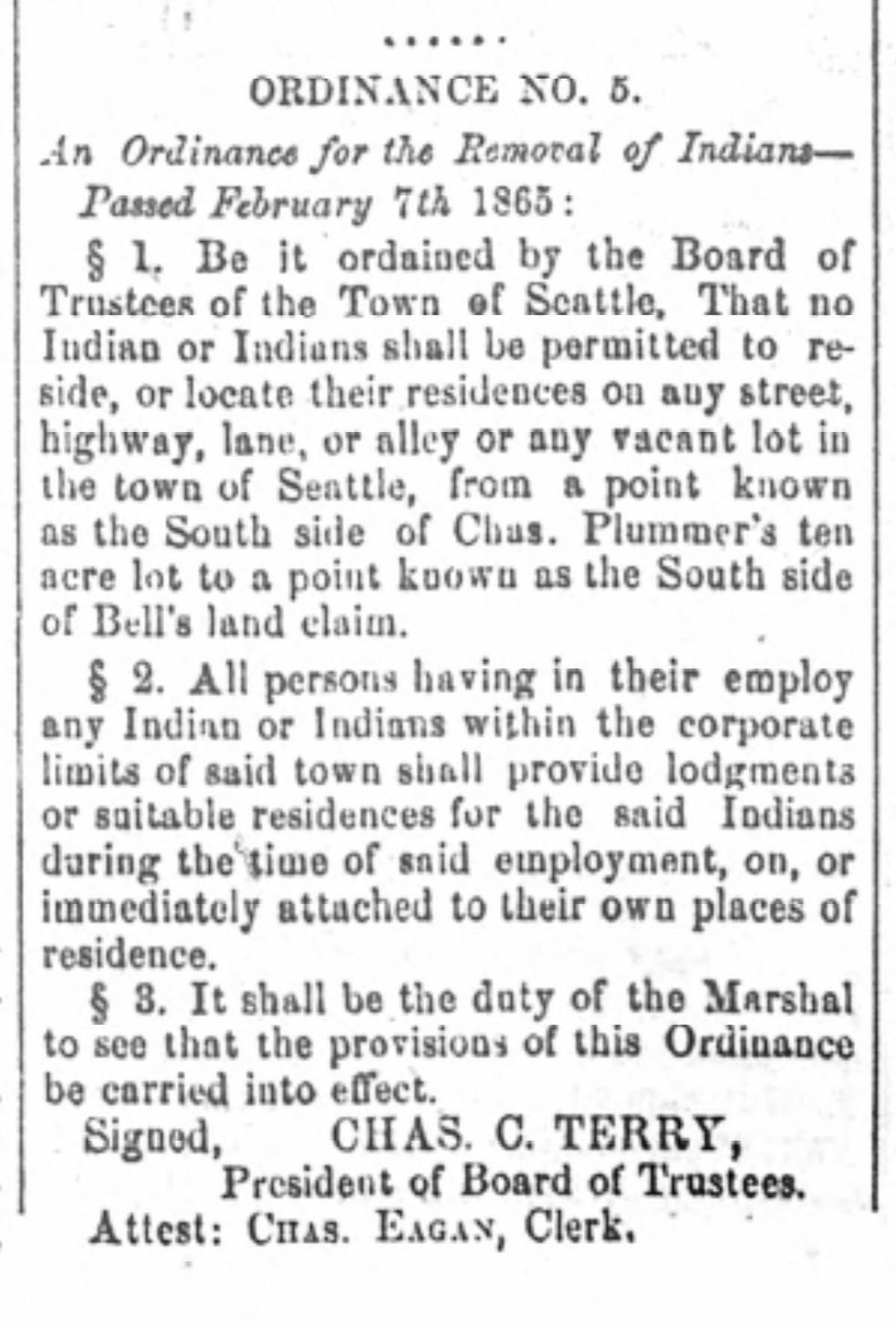 What is problematic is how this land was got by Charles Terry in the first place. As the first president of the Seattle board of trustees, Terry passed an ethnic cleansing ordinance on February 7th 18653. It read as follows: